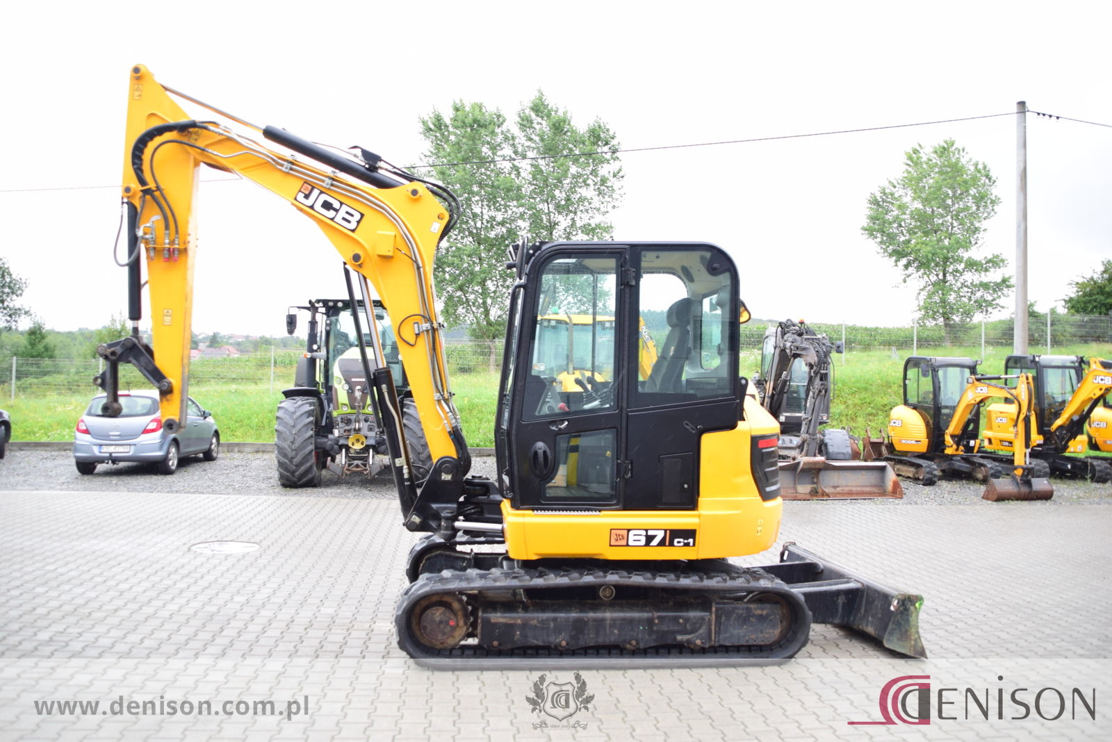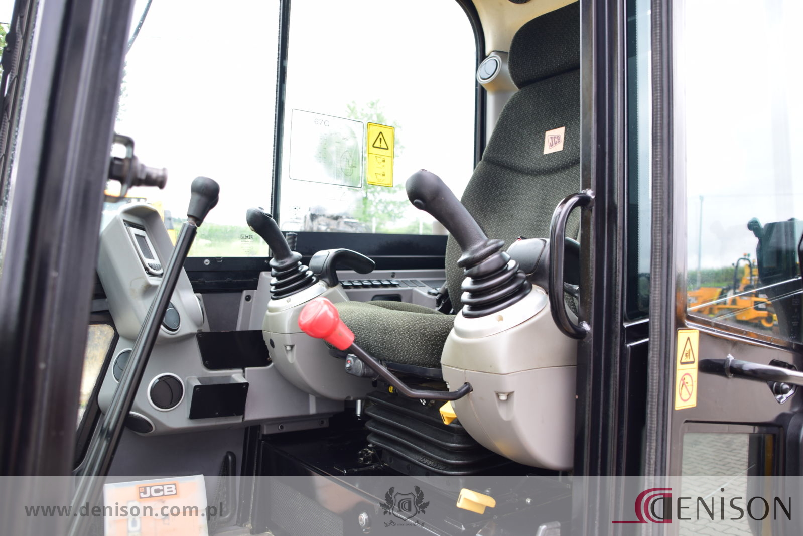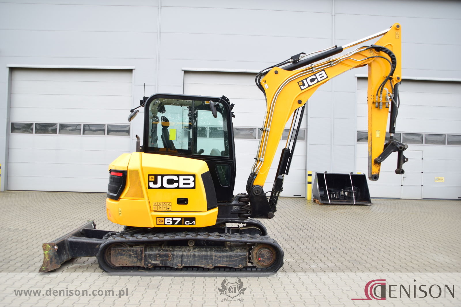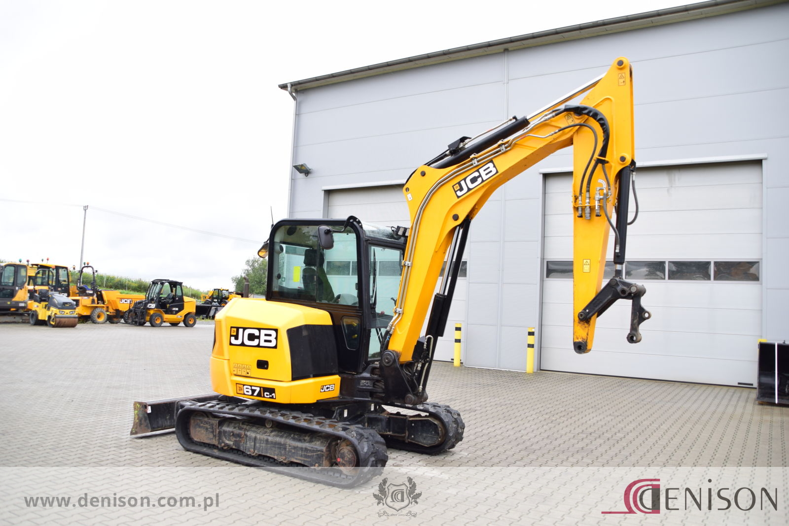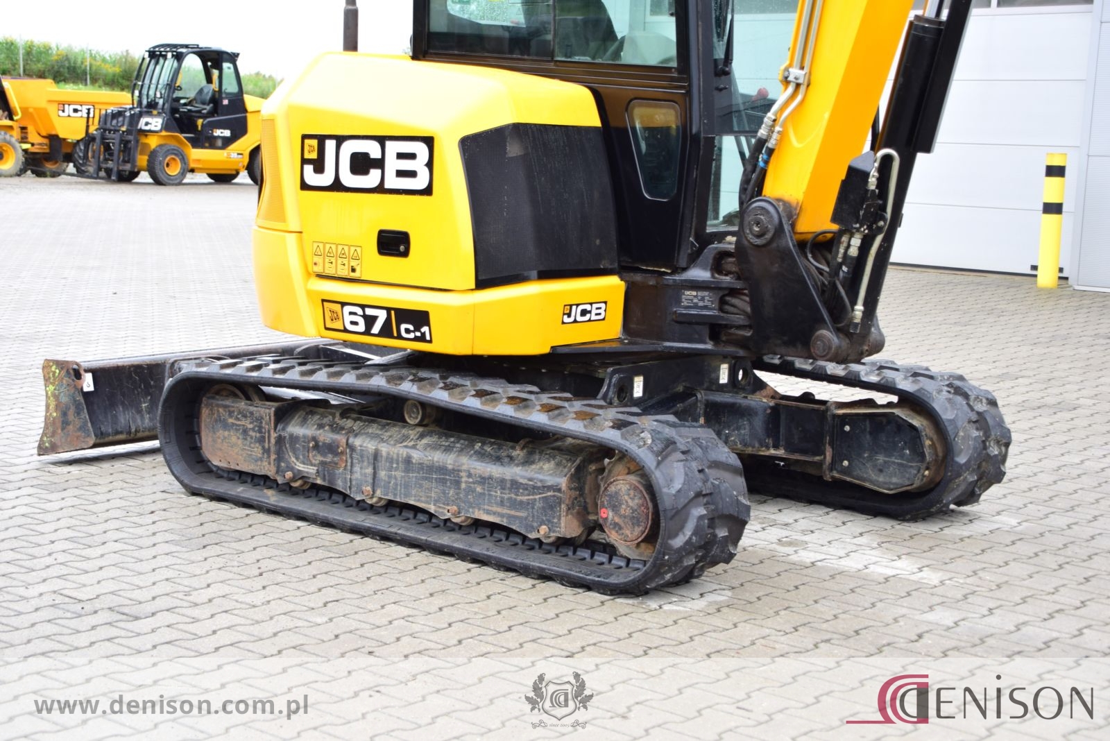 Koparka gąsienicowa JCB 67C-1 z kabiną zamkniętą i ogrzewaną, waga 6760 kg, gąsienice gumowe, lemiesz spycharkowy, podgrzewane siedzenie, dwie prędkości jazdy (wolna/szybka), 3 x instalacja hydrauliczna, przełącznik biegu jałowego typu “one touch”, oświetlenie robocze, łyzka koparkowa.