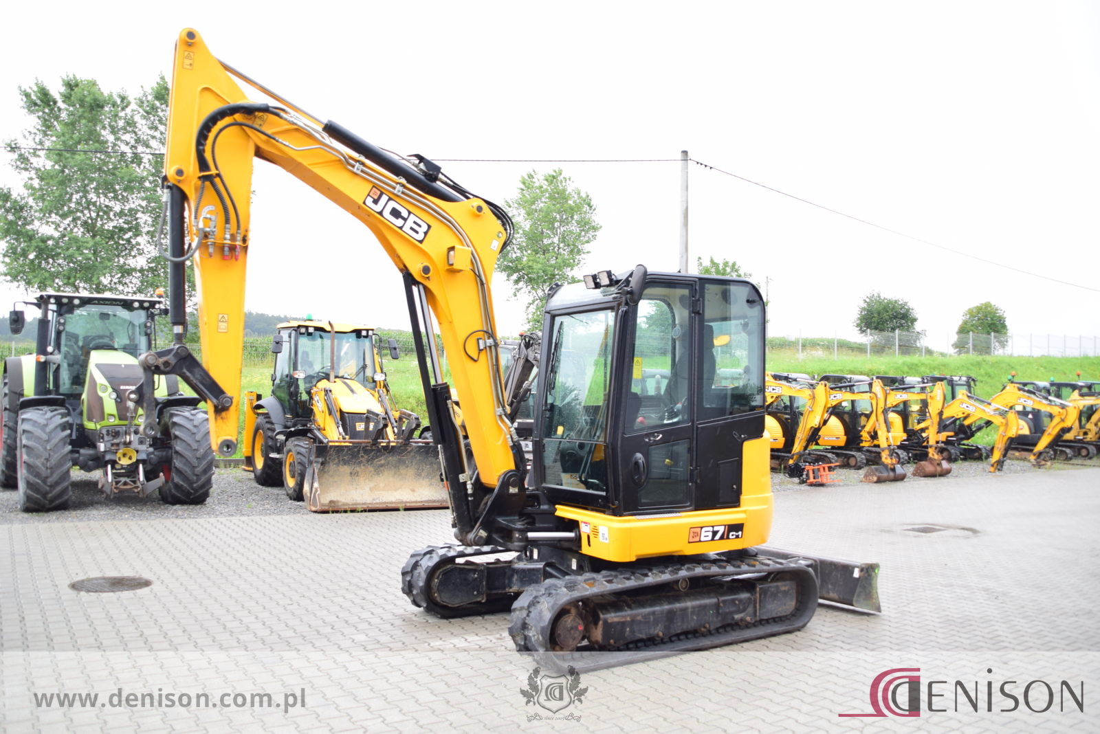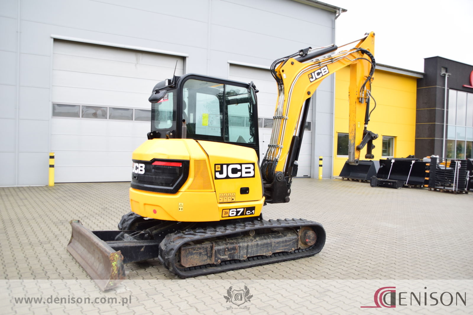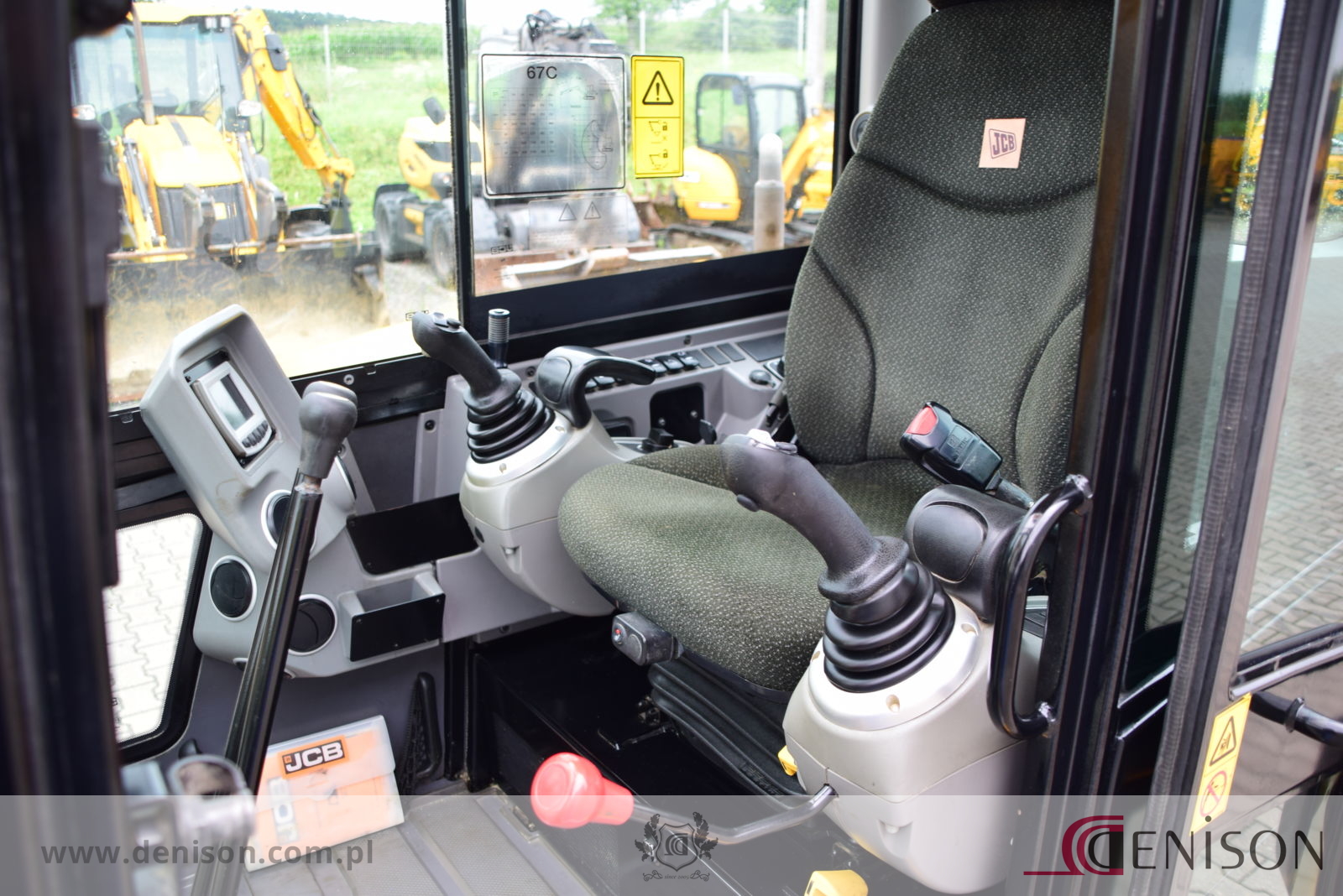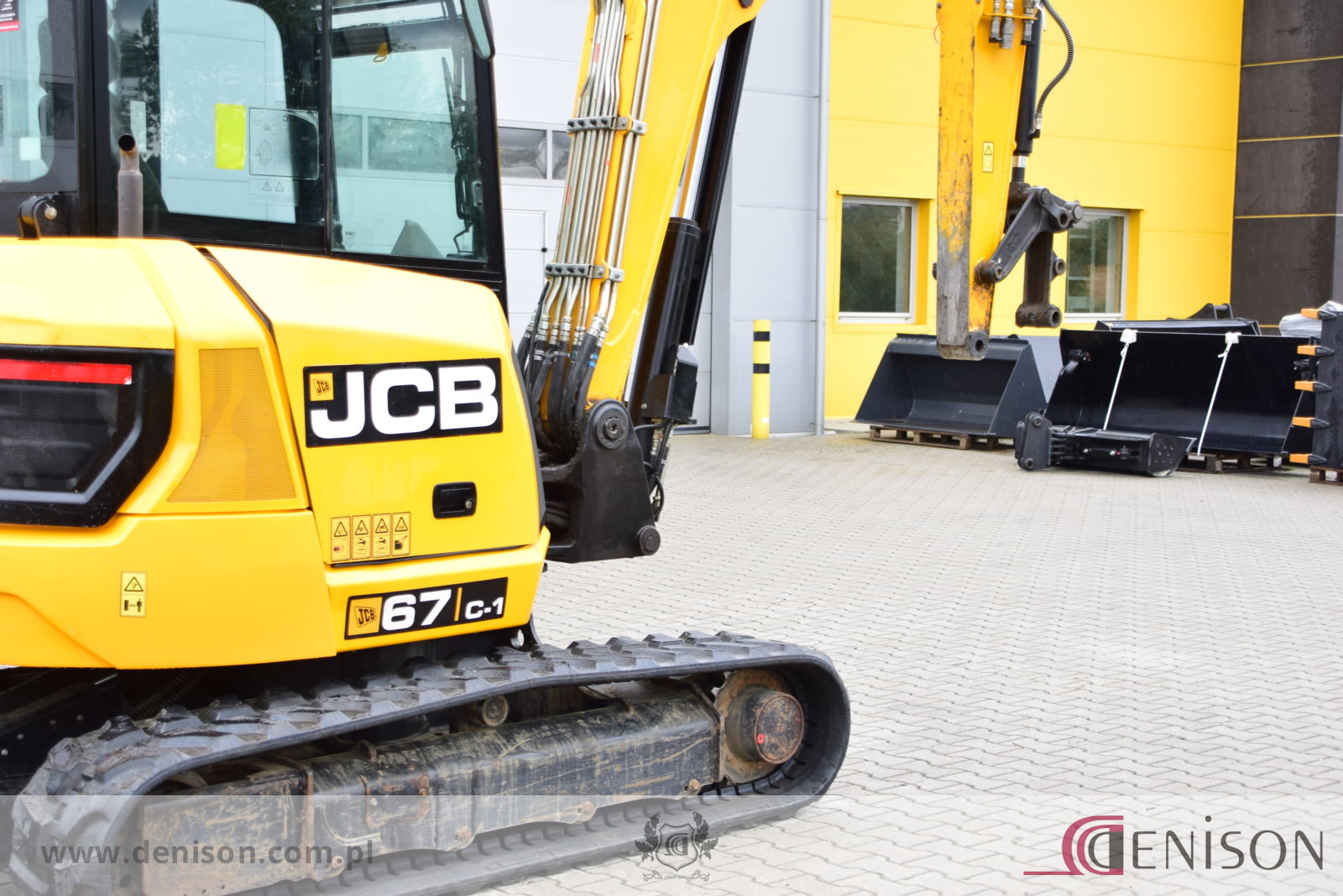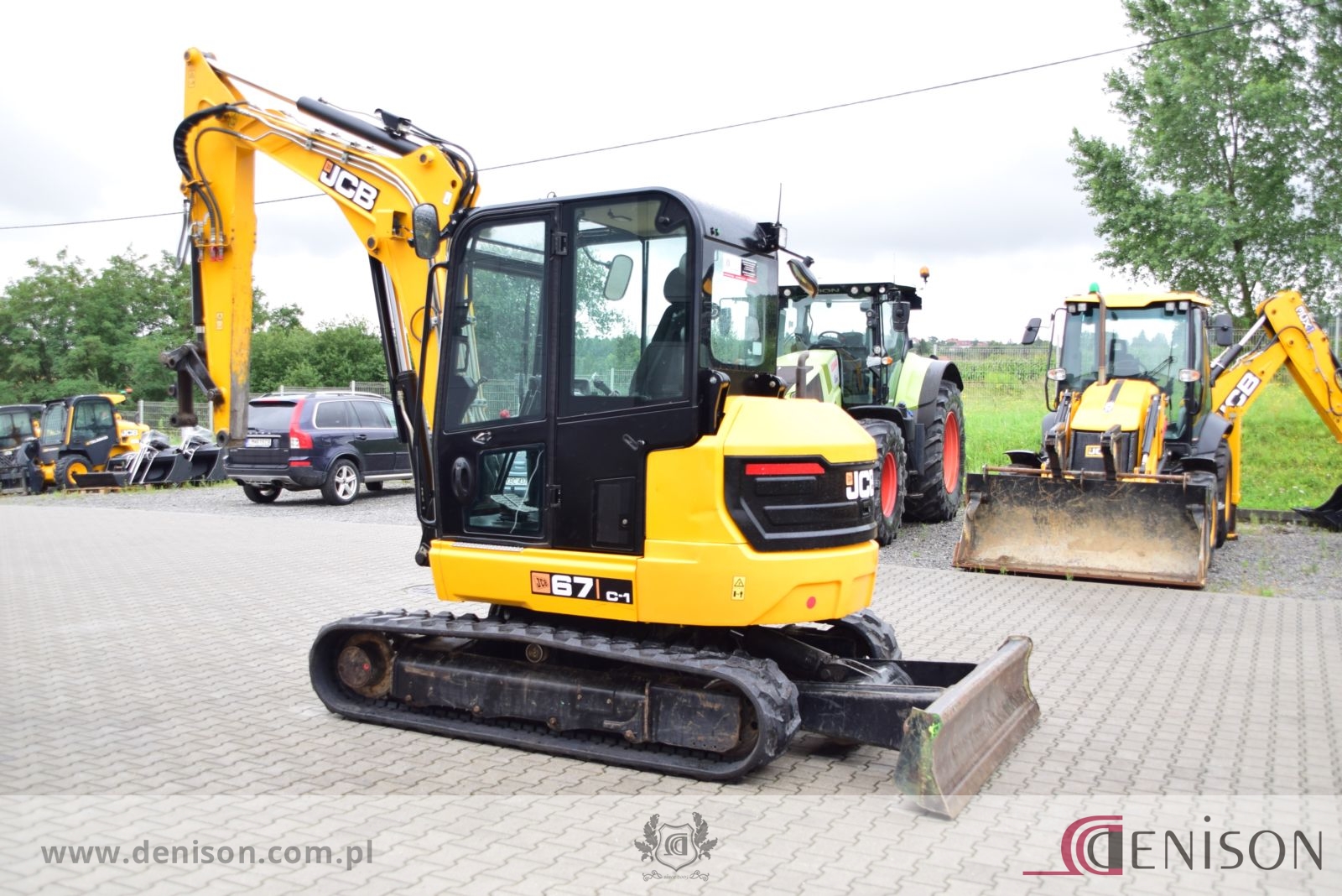 Koparka gąsienicowa JCB 67C-1 z kabiną zamkniętą i ogrzewaną, waga 6760 kg, gąsienice gumowe, lemiesz spycharkowy, podgrzewane siedzenie, dwie prędkości jazdy (wolna/szybka), 3 x instalacja hydrauliczna, przełącznik biegu jałowego typu “one touch”, oświetlenie robocze, łyzka koparkowa.